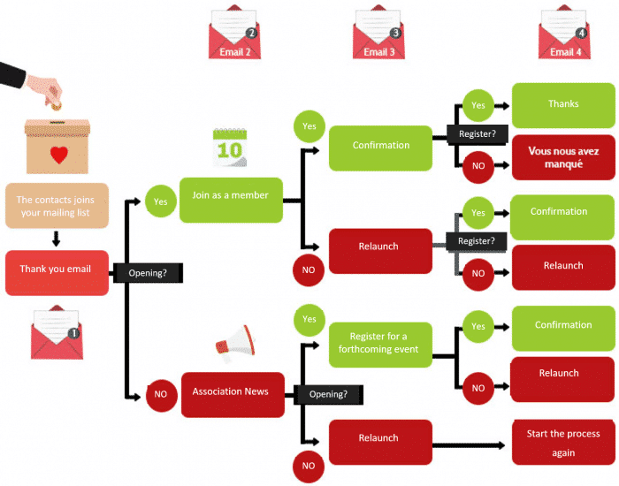 Like the film industry, the chances of bringing the viewer back to the cinema to see a sequel are greater if the original film was popular. Each email scenario can be seen as a strategy specific to each reaction of your recipients. Well developed, email campaigns will allow you to limit the lapsing of your members. You therefore increase the chances of loyalty and, above all, reduce re-acquisition costs.