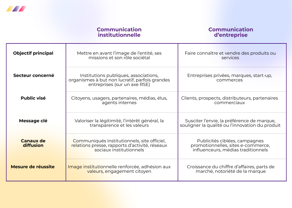 Tableau comparatif entre la communication institutionnelle et la communication d’entreprise