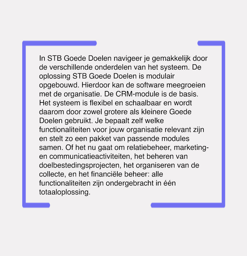 Veel goede doelen werken nog met losse systemen en Excel-lijsten, wat tijd kost en fouten veroorzaakt. Het whitepaper laat zien hoe STB Goede Doelen al je processen – van collecte en giftenadministratie tot marketingcampagnes – centraliseert en automatiseert. Zo kun je sneller schakelen, real-time inzicht krijgen in de status van projecten en je ROI verbeteren.